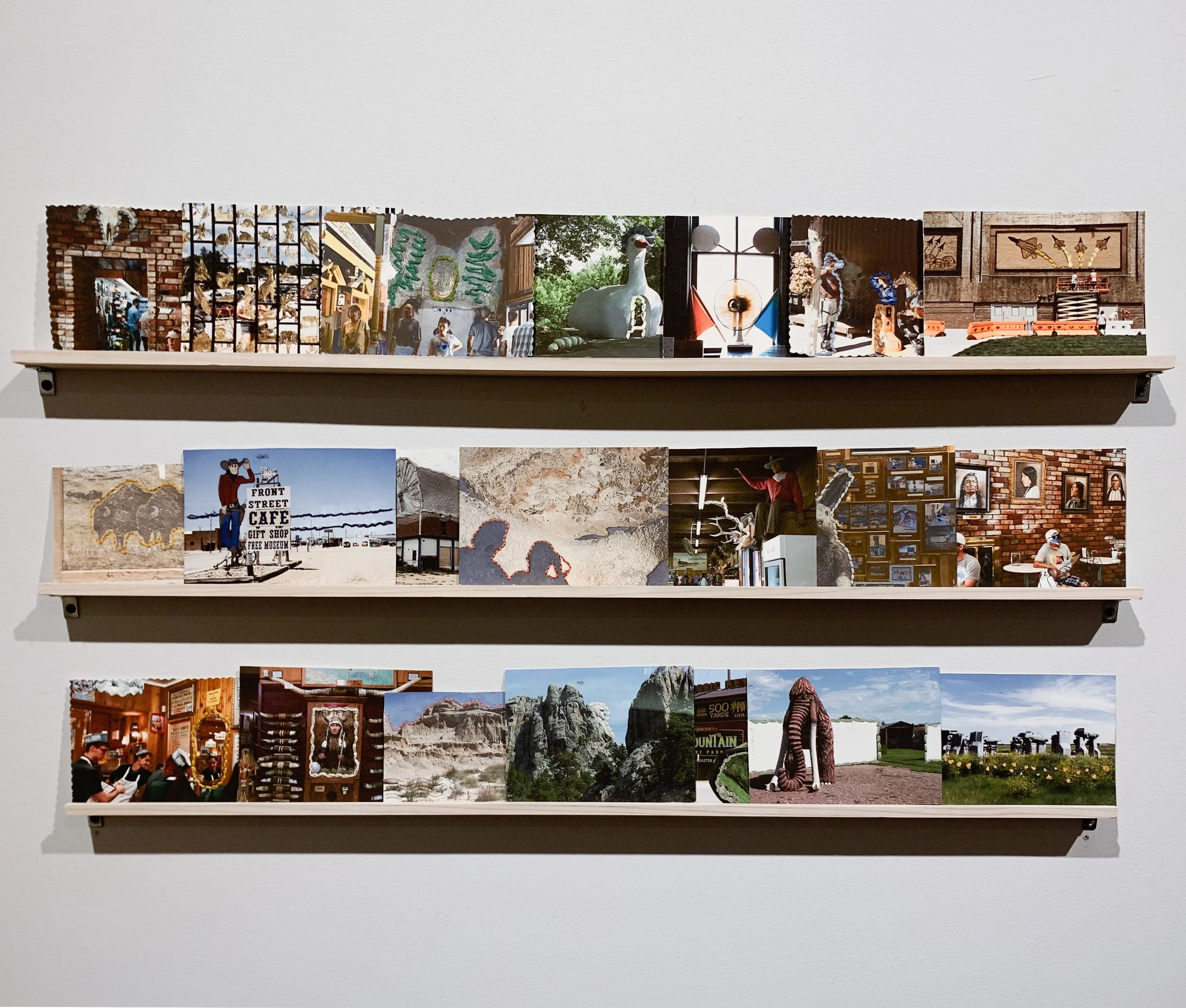 The Great Plains of the Midwest are known for their prairie fields and pioneer history, along with a landscape uninterrupted for miles. Although referred to as flyover country, this region is full of tourist destinations for the road-trippers making their way out West. Wish You Were Here examines the ways the Great Plains region is romanticized using legends, folklore, and histories. This history is often commodified through roadside attractions where tourists participate in rituals, like photo-ops or buying souvenirs, as experience and inclusion in these histories. The nostalgia of these rituals often clouds tourist perspectives, creating complicity in continuing flawed narratives.